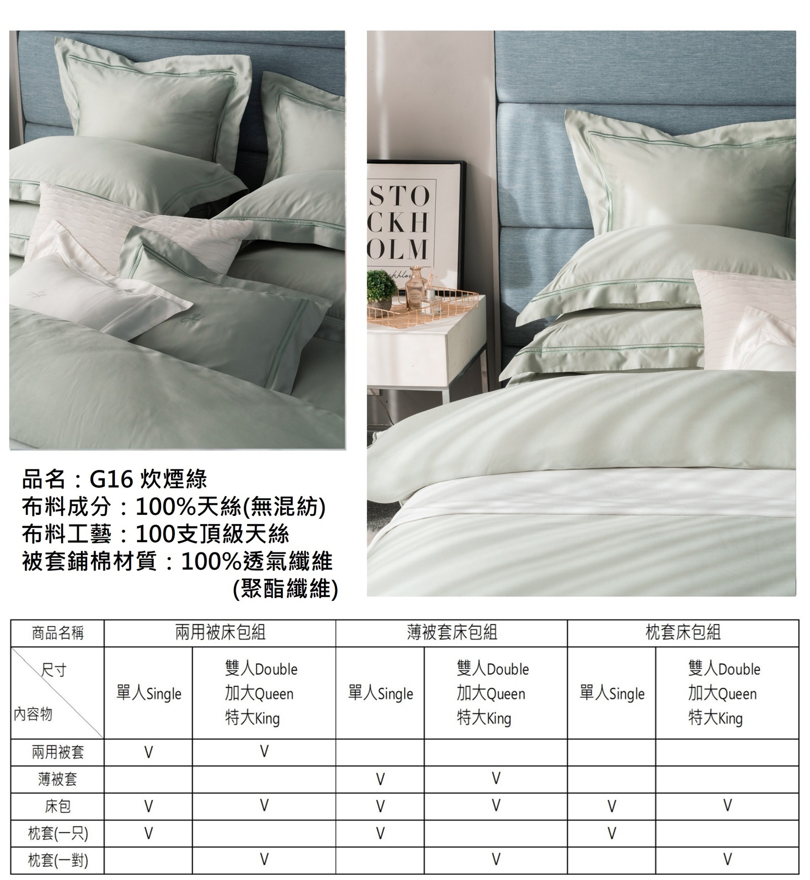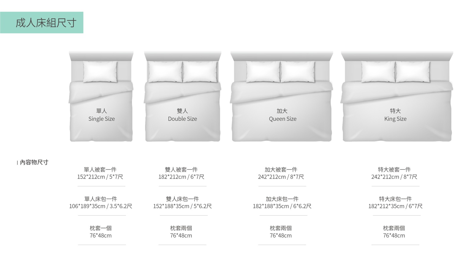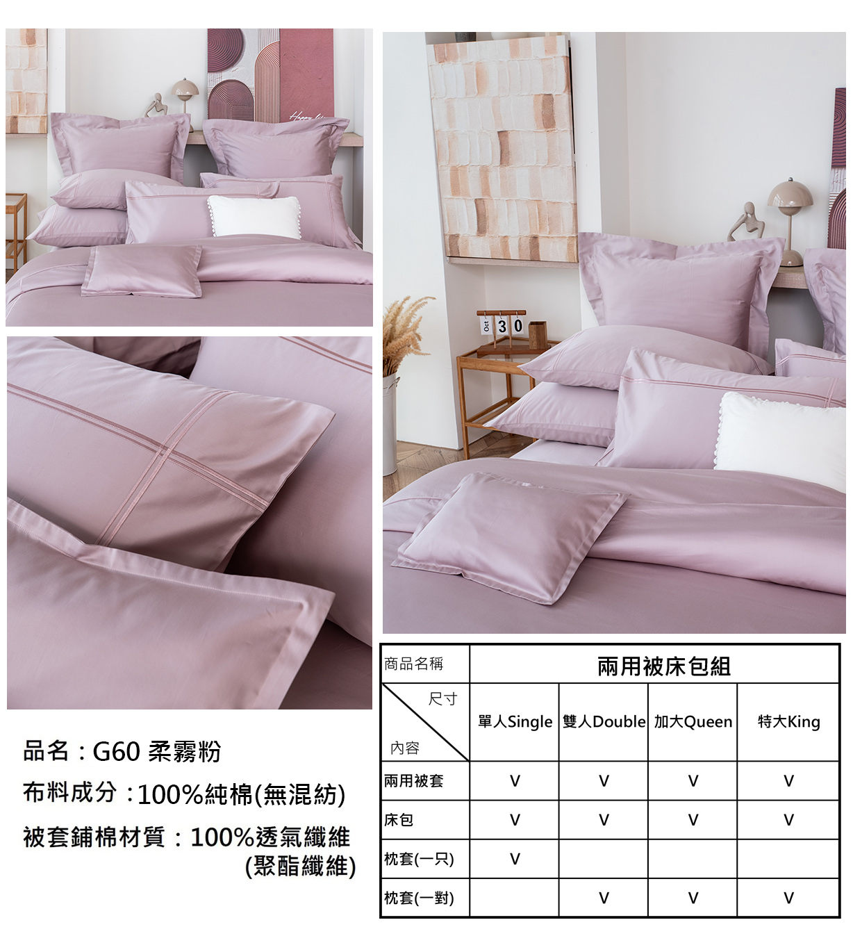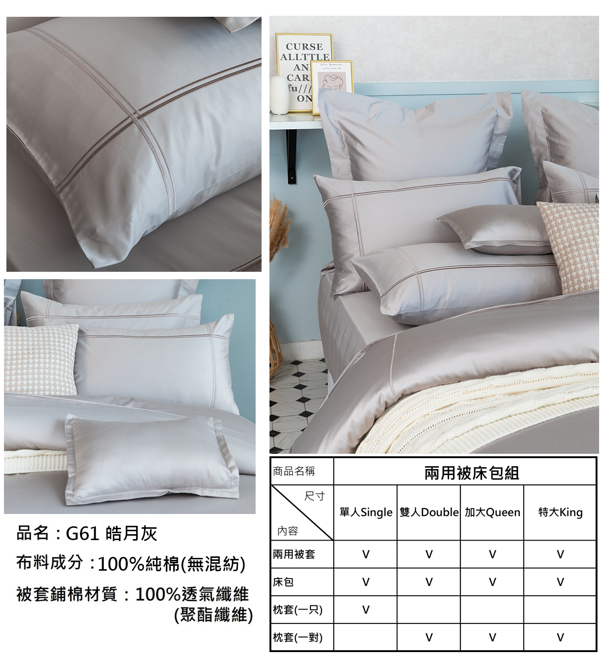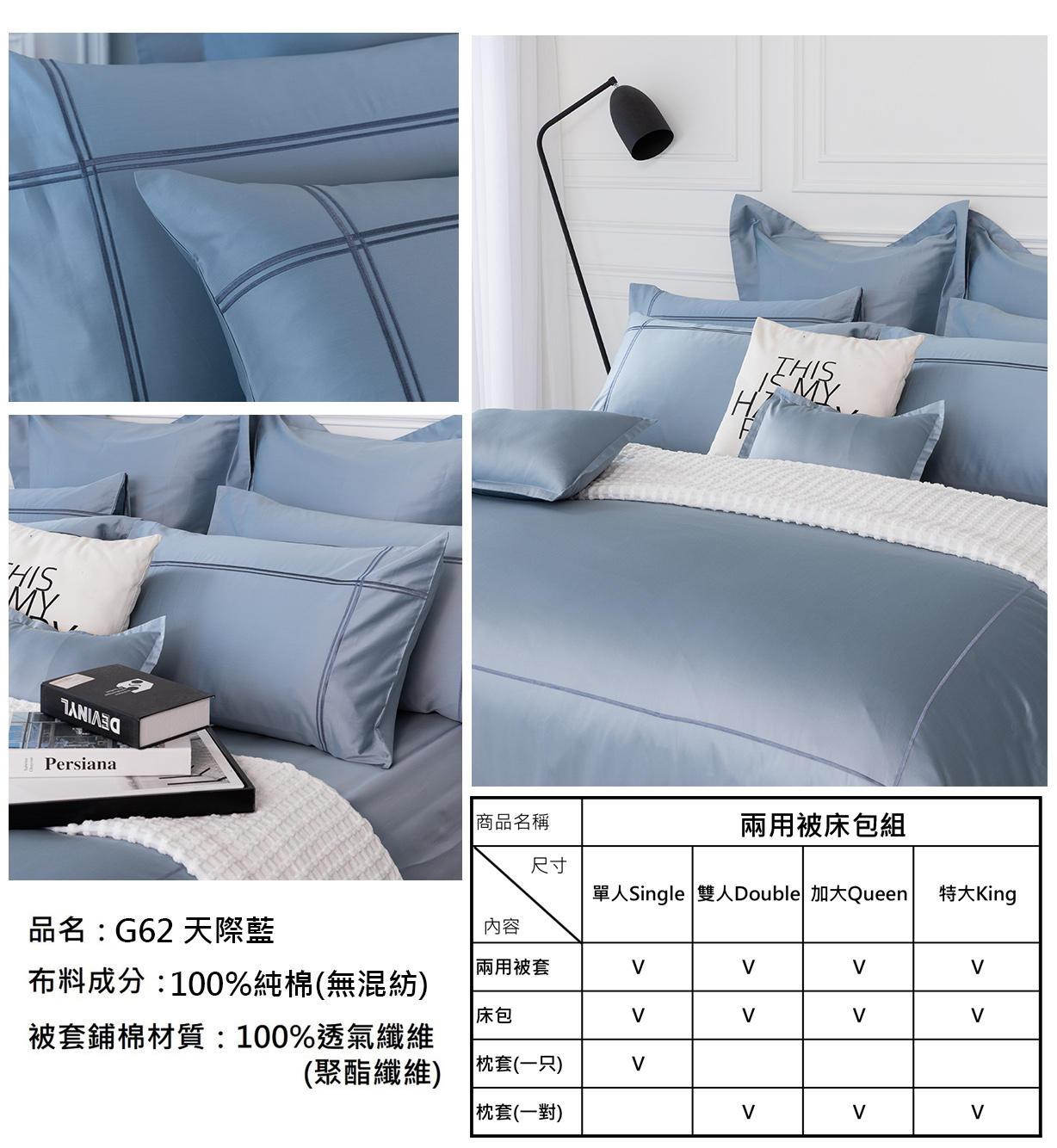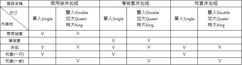 每一款寢具組都包含了二用被、床包、枕頭套*2