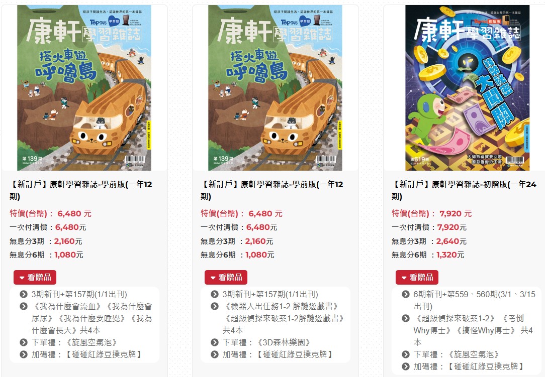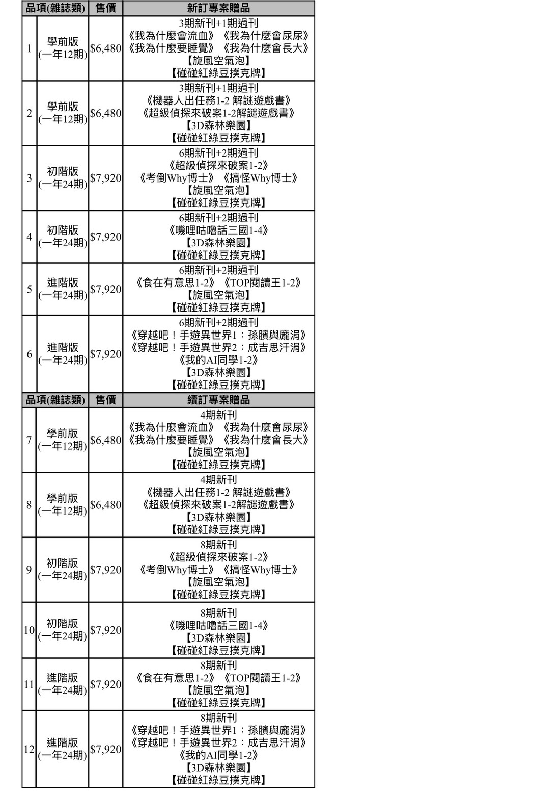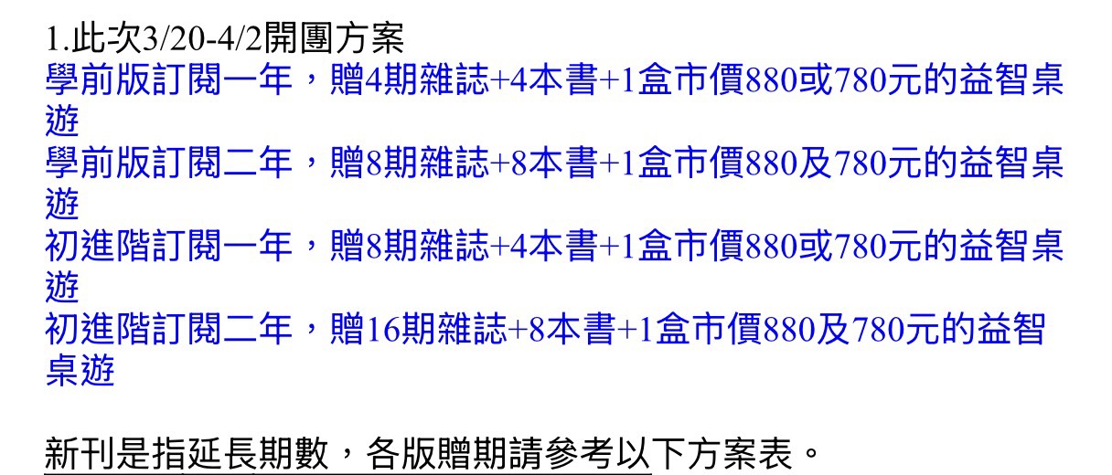 - 學前版訂閱一年,贈4期雜誌+4本書+1盒市價880或780元的益智桌遊